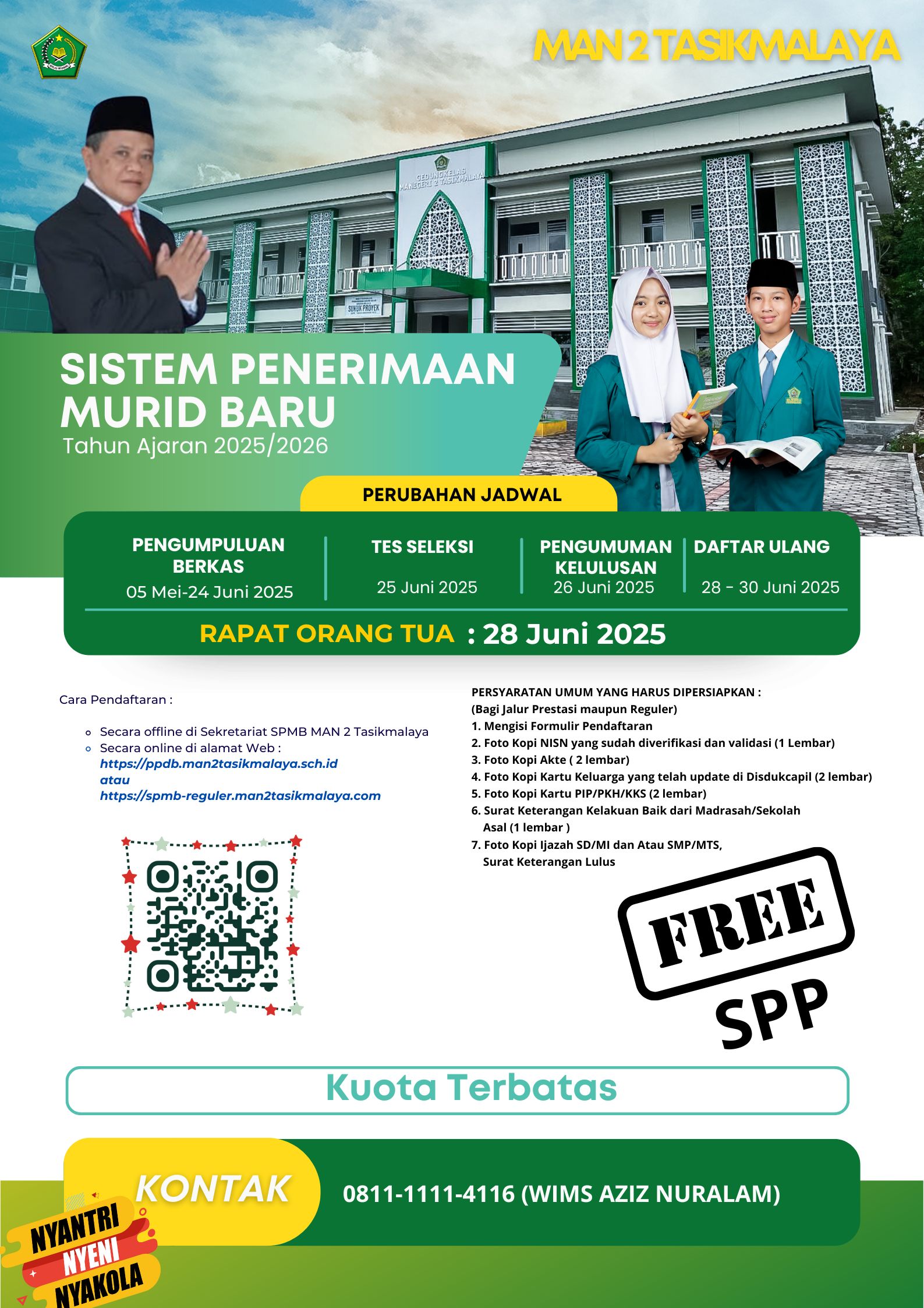 SPMB MAN 2 Tasikmalaya menyediakan SPMB jalur Reguler secara online diharapkan proses SPMB dapat berjalan cepat dan bisa dilakukan dimanapun dan kapanpun selama sesi SPMB dibuka. Proses pendaftaran calon siswa baru tidak menggunakan formulir konvensional hanya dengan mengakses website SPMB Online SPMB MAN 2 Tasikmalaya. Jalur ini menggunakan sistem Tes Seleksi akademik dan BTQ dalam menentukan kelulusanya.
